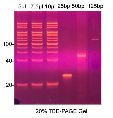 本產(chǎn)品為雙鏈DNA Marker,適用于非變性的PAGE電泳和瓊脂糖凝膠電泳,不適用于尿素PAGE電泳。由于片段較小,建議使用高分辨率瓊脂糖凝膠電泳分離。按照每次上樣5μl計算,該產(chǎn)品可以使用50次。