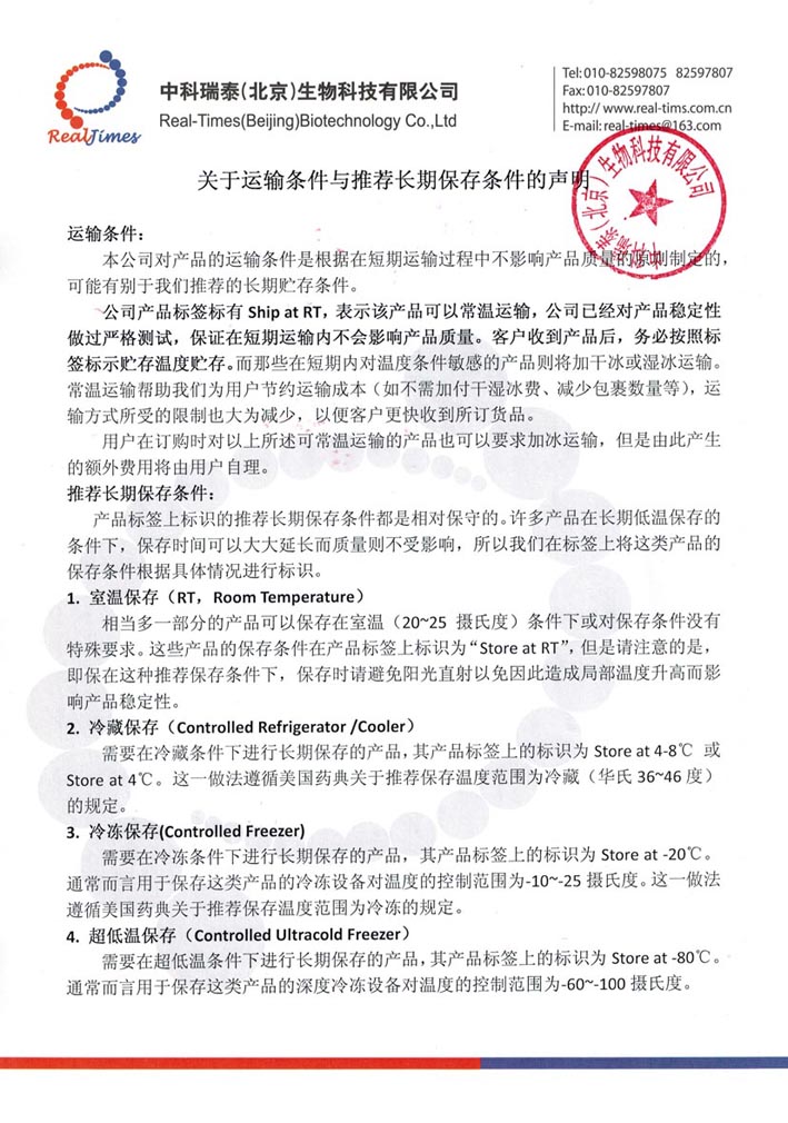 關(guān)于運(yùn)輸條件與推薦長(zhǎng)期保存條件的聲明