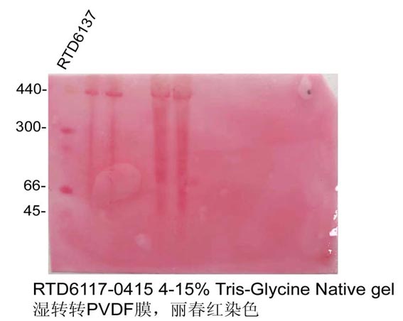 推薦使用RTD6137 非變性電泳蛋白質Marker(45-880 kD),RTD6142 高分子量非變性電泳蛋白質Marker II(45-669 kD)或者RTD6144 寬分子量非變性電泳蛋白質Marker 21-880 kD。然而由于凝膠濃度較低,低于45 kD條帶會壓在前沿,可能不可見。