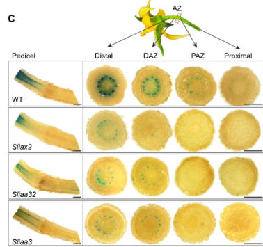 鑒于 SlGATA6 調(diào)控生長(zhǎng)素運(yùn)輸載體 SlLAX2的表達(dá),該研究通過生長(zhǎng)素特異性抗體的免疫熒光雜交技術(shù)及離區(qū)組織切片分析,在細(xì)胞層面揭示了生長(zhǎng)素的空間分布模式,首次實(shí)現(xiàn)了生長(zhǎng)素梯度的空間維度解析,證實(shí)了 SlGATA6 是維持這一梯度的關(guān)鍵。通過免疫熒光雙標(biāo)試驗(yàn)發(fā)現(xiàn),SlIAA3 與 SlIAA32 蛋白信號(hào)強(qiáng)度在遠(yuǎn)軸端到近軸端方向呈現(xiàn)相反的分布規(guī)律,即遠(yuǎn)軸端 SlIAA32 信號(hào)強(qiáng),SlIAA3 信號(hào)弱,近軸端則反之。值得注意的是,SlIAA32 和 SlIAA3 的總信號(hào)強(qiáng)度由遠(yuǎn)軸端到近軸端顯著減弱,形成了離區(qū)生長(zhǎng)素的信號(hào)梯度。由于 SlIAA32 和 SlIAA3 均可以提高生長(zhǎng)素信號(hào),且破壞 SlIAA32 和 SlIAA3 的功能都能夠?qū)е律L(zhǎng)素信號(hào)嚴(yán)重受損,表明 SlIAA32 和 SlIAA3 是建立生長(zhǎng)素響應(yīng)梯度的關(guān)鍵因子。