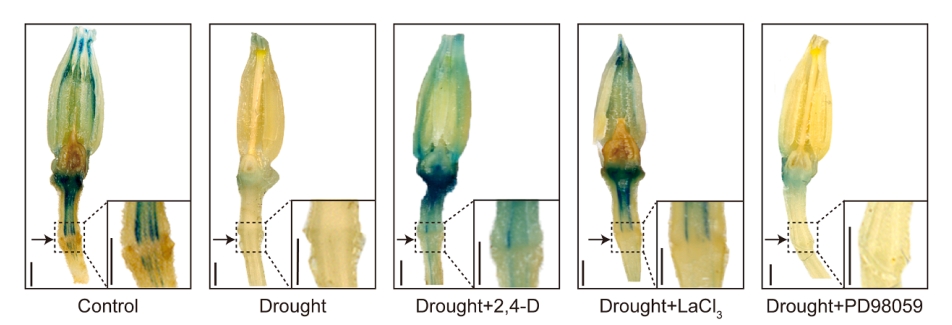 該研究發(fā)現(xiàn),干旱脅迫下SlCBL11/SlCIPK10-SlLHP1b信號模塊誘導(dǎo)番茄落花的作用機制。干旱脅迫激活SlCBL11-SlCIPK10鈣離子感受器模塊,磷酸化修飾SlLHP1b。磷酸化的SlLHP1b通過H3K27me3依賴的方式結(jié)合下游生長素合成基因SlYUCs的啟動子區(qū)域抑制其表達,導(dǎo)致雄蕊中生長素合成減少,破壞離區(qū)生長素梯度,誘發(fā)番茄落花。該研究揭示了干旱下鈣信號通過表觀遺傳調(diào)控生長素合成參與番茄落花的分子機制,進一步完善了植物逆境響應(yīng)中鈣信號與表觀遺傳調(diào)控的分子網(wǎng)絡(luò),還為培育耐旱、高產(chǎn)的品種提供了潛在的基因靶點。研究成果對提高逆境下的番茄產(chǎn)量,提高經(jīng)濟效益具有重要的指導(dǎo)意義。該研究獲國家重點研發(fā)計劃項目、國家自然科學(xué)基金面上項目和青年科學(xué)基金等項目支持。