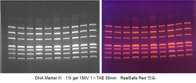將RealSafe Red試劑按1:10000溶于瓊脂糖凝膠溶液中,充分混勻。(例如:將5 μl RealSafe Red 試劑加入到50 ml 凝膠溶液中)。注:由于RealSafe Red 具有出色的熱穩(wěn)定性,可將試劑直接加入高溫的凝膠溶液中,而不用等凝膠溶液冷卻后再加入。