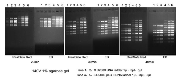 2.1 用制備凝膠電泳對(duì)應(yīng)的1×電泳緩沖液將RealSafe Red稀釋約5000倍,制成即用型染色溶液。(例如:將20 μl RealSafe Red加入到100 ml 緩沖液中)。