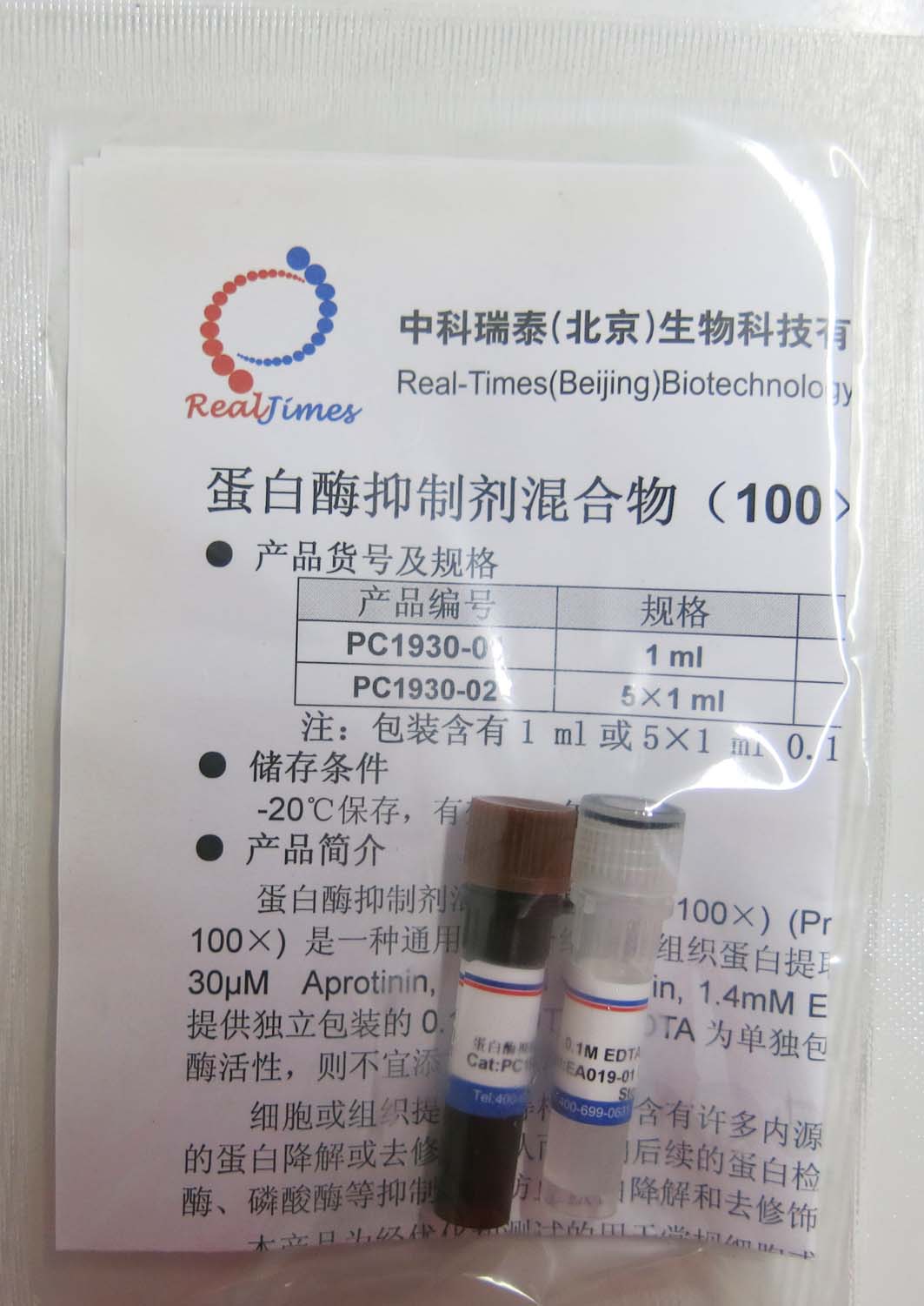 本蛋白酶抑制劑混合物為100×的儲存液,使用時按照1:100的比例加入到裂解液中(例如,1ml裂解液中加入10μl蛋白酶抑制劑混合物),混勻后即可使用。含有蛋白酶抑制劑混合物的裂解液宜現(xiàn)用現(xiàn)配,不宜配制后凍存待后續(xù)使用。根據(jù)需要,0.1M的EDTA也按照1:100的比例加入到裂解液中。