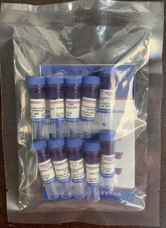 5×SDS-PAGE蛋白上樣緩沖液 (還原)是以溴酚藍為染料,5倍濃縮的SDS-PAGE凝膠電泳上樣緩沖液,應(yīng)用于還原型SDS-PAGE的蛋白樣品制備和上樣。該緩沖液中含有DTT,可使蛋白質(zhì)分子的鏈內(nèi)二硫鍵和鏈間二硫鍵斷裂,通過二硫鍵連接的各蛋白亞單位彼此分離,經(jīng)考馬斯亮藍染色以后在電泳凝膠上顯現(xiàn)清晰蛋白條帶。