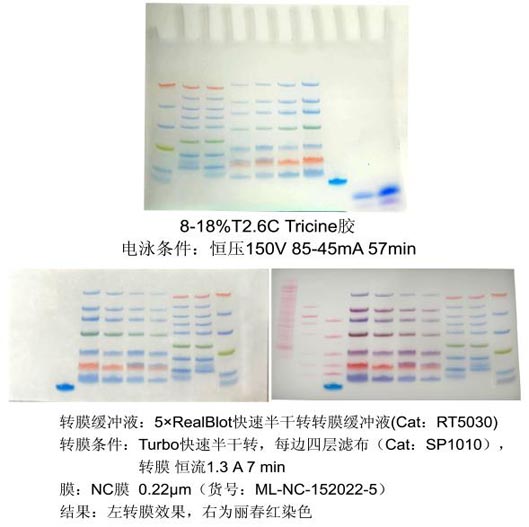5×RealBlot快速半干轉(zhuǎn)轉(zhuǎn)膜緩沖液使用獨特配方,使用半干轉(zhuǎn)法(Semi-dry blot)方法,能在10-20分鐘內(nèi)高效快速地將蛋白轉(zhuǎn)移到印跡膜(PVDF膜或NC膜)上。