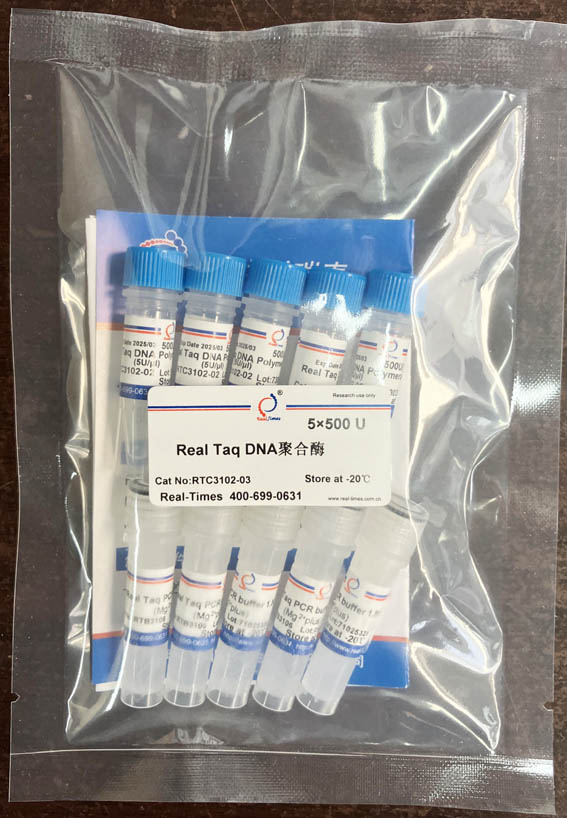 DNA Polymerase是從克隆有Thermu aquaticus DNA Polymerase基因的大腸桿菌經誘導表達后分離純化的,其分子量為94 KD。具有5’-3’DNA聚合酶活性和5’-3’外切核酸酶活性,無3’-5’外切酶活性。在PCR反應中,Real Taq DNA Polymerase延伸速度為1-2 kb/分鐘,產物3’端帶A,可直接用TA載體克隆。