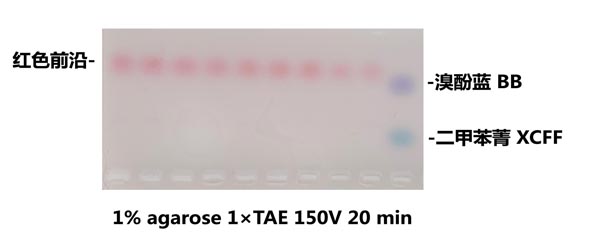 PCR染料添加劑為含有紅色染料和助沉劑的混合物,按照10倍體積稀釋于PCR反應(yīng)體系中,PCR結(jié)束后可以直接上樣電泳,不用再與loading buffer混合,方便快捷。特有的紅色染料不會影響Taq酶活性,電泳時指示前沿為紅色。