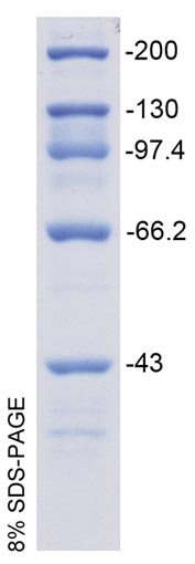 本產(chǎn)品包含5種蛋白質混合物,分子量范圍為43kD-200kD,經(jīng)過SDS-PAGE電泳,用考馬斯亮藍染色后可以得到分布均勻密度相近的5條帶,可以用來判斷SDS-PAGE電泳后蛋白質的分子量。
