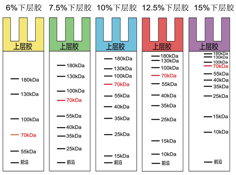 kDa,含有 10 條蛋白條帶 ) 在不同濃度的 SDS-PAGE凝膠中的分離示意圖。因溫度、pH 值等因素不同,實(shí)際分離情況會略有出入,本圖僅供參考。