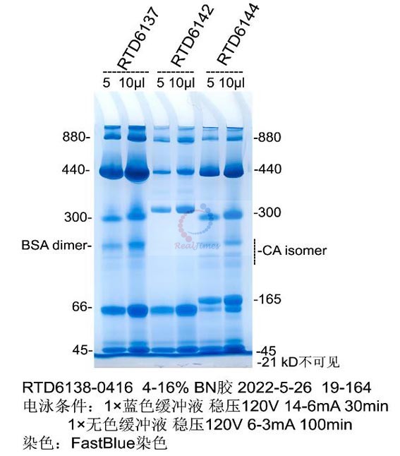 2. 該產(chǎn)品不含蛋白凝膠制備試劑,您可以選擇非變性PAGE凝膠制備及電泳試劑盒(貨號(hào):RTD6130)或者蛋白預(yù)制膠(貨號(hào)RTD6118)。如自備試劑,經(jīng)典Laemmli系統(tǒng)中把制膠溶液、電泳緩沖液和上樣緩沖液中的SDS和還原劑(DTT或β-巰基乙醇)全部去除即可進(jìn)行非變性電泳。