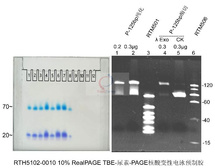 單鏈DNA或RNA樣品可以用單鏈DNA PAGE電泳染色試劑盒(貨號:RTS5103),核酸PAGE電泳染色試劑盒(貨號:RTS5102)或核酸快速高靈敏度染色試劑盒(貨號:RTS5101)染色均可以得到清晰的條帶分離效果。注:如果使用核酸染料染色,RealSafe Red(貨號:GR002)或RealSafe All(貨號:GR004)核酸染料結合單鏈核酸效果最佳,強烈建議使用以便獲得最佳效果的膠圖。其余染料如GelRed,Goldview,EB等染色效果不好。