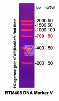 本產(chǎn)品是由6條帶狀雙鏈DNA條帶組成,適用于瓊脂糖凝膠電泳中DNA條帶的分析。產(chǎn)品中已含有1×loading buffer,可根據(jù)實(shí)驗(yàn)需要,直接取2-5μl電泳,使用方便,電泳圖像清晰。6條帶的大小分別為200,400,700,1000,15002000bp。其中1000bp條帶含量為100ng/5μl,顯示加亮帶,其余條帶含量為50ng/5μl。