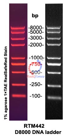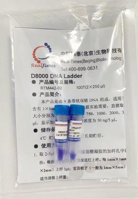 本產(chǎn)品是由9條帶狀雙鏈DNA組成,適用于瓊脂糖凝膠電泳中DNA條帶的分析。產(chǎn)品中已含有1×loading buffer,可根據(jù)實(shí)驗(yàn)需要,直接取2-5μl電泳,使用方便,電泳圖像清晰。9條帶的大小分別為100,250500,7501000,20003000,50008000bp。其中750 bp條帶為100 ng/5 μl,顯示加亮帶,其余條帶濃度為50 ng/5 μl。