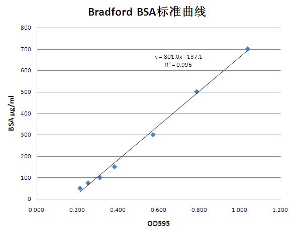 7. 以BSA含量為縱坐標(biāo)A595讀數(shù)為橫坐標(biāo),繪制標(biāo)準(zhǔn)曲線,計(jì)算樣品中的蛋白濃度。如果所得到的蛋白濃度不在標(biāo)準(zhǔn)曲線范圍內(nèi),請(qǐng)稀釋樣品后重新測(cè)定。