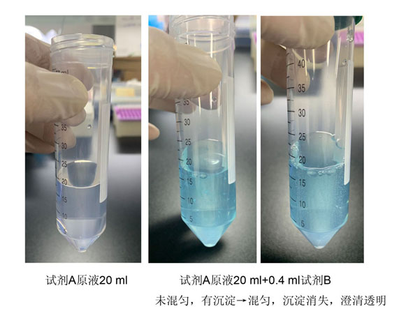 如,取50ml 試劑A與1ml試劑B混合,配成51 ml BCA工作液。兩者混合時(shí)會(huì)有沉淀形成,徹底混勻后沉淀消失,溶液應(yīng)為澄清淡藍(lán)色溶液。